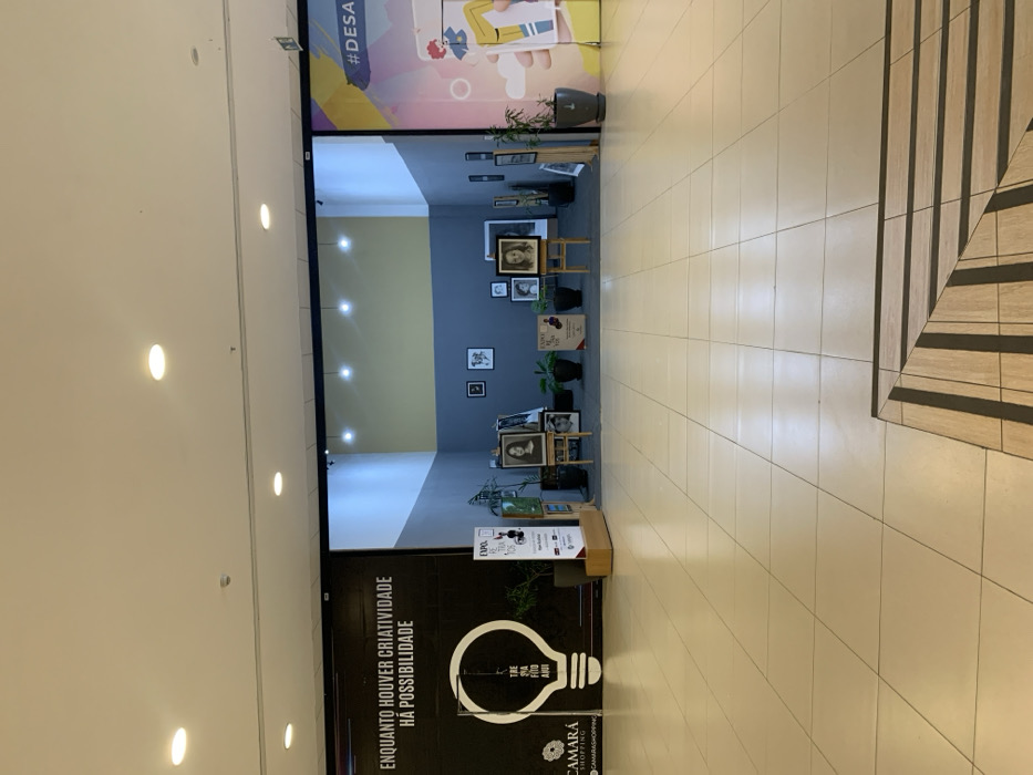 This image depicts an indoor scene within Camará Shopping, located in Camaragibe, Brazil. The setting is a clean, well-lit shopping mall corridor featuring light-colored tiled flooring, with a section of decorative wood-patterned tiles in the foreground right. Recessed ceiling lights provide illumination. On the left, a large black banner is present, displaying the white Portuguese text "ENQUANTO HOUVER CRIATIVIDADE HÁ POSSIBILIDADE" (While there is creativity, there is possibility) and a prominent white outline of a lightbulb containing the text "TIRE SUA FOTO AQUI" (Take your photo here). The "CAMARÁ SHOPPING" logo is visible at the bottom left of this banner. A dark planter containing green foliage is positioned in front of the banner. Directly opposite the viewer, a recessed exhibition space is visible. This area features a two-toned wall, with a darker blue-grey lower section and a lighter yellowish-grey upper section, and is illuminated by several spotlights from above. Within this space, multiple framed portraits are displayed on wooden easels and hanging on the back wall. Several dark planters with green foliage are strategically placed throughout the exhibit. Two vertical signs, one on the left and one on the right within the exhibit, partially read "EXPO. DA ARTE FOTO CAMARA Shopping," indicating a photography or art exhibition by the shopping center. To the far right, a large, colorful banner with yellow, purple, and blue tones is visible. It features the partial text "#DESA" and illustrations of a person interacting with a mobile phone. Another dark planter with foliage is positioned in front of this banner. No individuals are present in the visible area of the image.