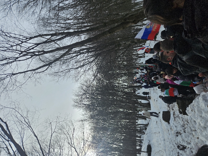 A large procession of individuals, estimated in the hundreds, ascends a snow-covered, uphill path within a dense deciduous forest in Shipka, Bulgaria. The sky is overcast, and the trees are bare, indicative of winter conditions. Participants, dressed in heavy winter clothing, form a continuous line along the packed snow trail. Prominently displayed in the mid-ground on the right is a Russian flag, featuring white, blue, and red horizontal stripes with "РОССИЯ" inscribed in Cyrillic. Multiple Bulgarian flags, characterized by white, green, and red horizontal stripes, are visible among the crowd further up the path. An individual is observed walking off the main trail to the left, navigating deeper snow. At the crest of the hill, partially obscured by trees, a large, grey, angular structure, resembling a monument, is discernible, marking the procession's destination. The perspective is from within the lower-mid section of the advancing crowd.