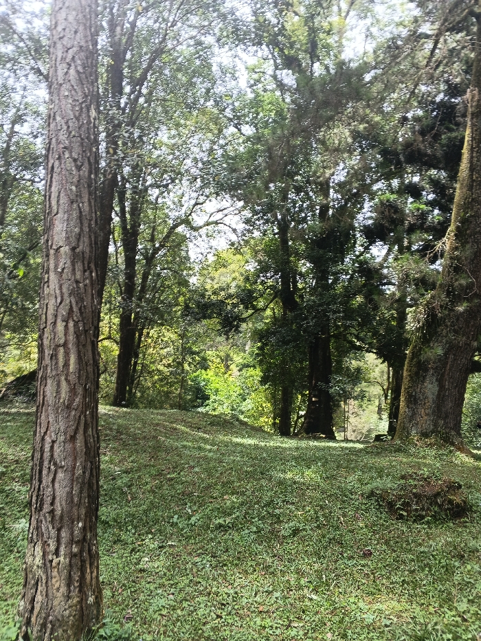 The image displays a dense forested environment located within the city of Tây Ninh, Vietnam. The foreground features a gently sloping terrain covered uniformly by short green grass and sparse herbaceous plants. A prominent tree trunk with heavily textured brown bark extends vertically along the left side of the frame. On the lower right, a small, dark, moss-covered organic mound rises slightly from the grass. The midground and background are populated by numerous trees of varying species and sizes, their trunks exhibiting diverse bark patterns, with many showing signs of moss and epiphytic growth. A thick canopy of green foliage dominates the upper portion of the frame, through which bright, diffuse natural light filters, illuminating sections of the ground. No human subjects, animals, or man-made objects are present within the scene.