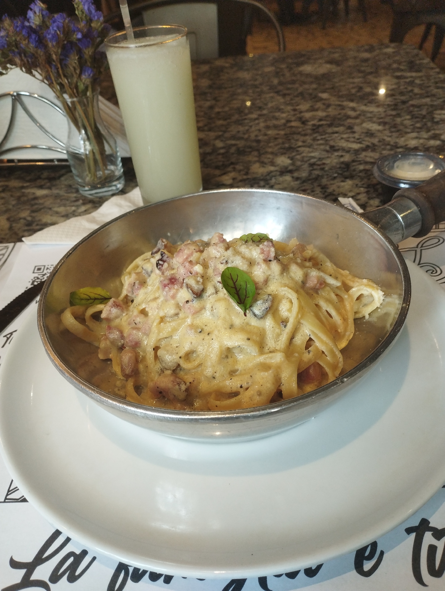 close-up of a plate of pasta carbonara served in a small, handled, stainless steel pan on a white plate. The pasta is covered in a creamy sauce with visible pieces of meat, possibly bacon or pancetta, and garnished with small green leaves. Beside the pasta is a tall glass of a light-colored drink with a straw, and a vase with purple flowers. The plate and pan are sitting on a patterned surface, likely a table covering, with printed text in the background. The overall setting suggests a restaurant or cafe environment. It is not possible to determine if the image was taken in Valencia, Venezuela from the image.