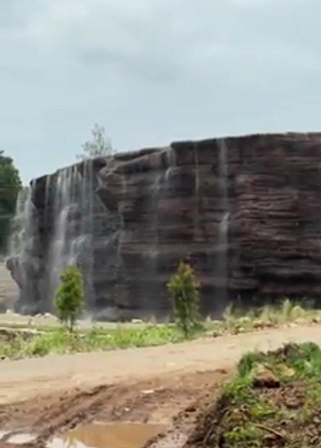 n artificial waterfall. The structure appears to be made of reddish-brown rock and is surrounded by sparse greenery. A dirt road runs in front of the waterfall, showing signs of recent rain. The sky is overcast. The camera pans left to reveal a golf cart parked on a paved area, with tropical plants nearby. The background includes more greenery and stone structures.