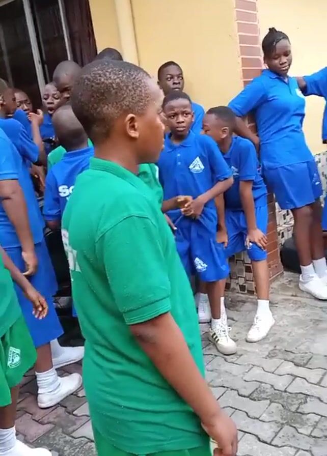 A group of young people in school uniforms stand outside a building on a paved area. Some of the students wear blue tops and blue skirts or shorts, while others are in green. There is a man wearing a blue shirt and gray pants. He appears to be speaking to the students in the blue uniforms. The text “Solei High School” is visible on the back of one of the green shirts.
