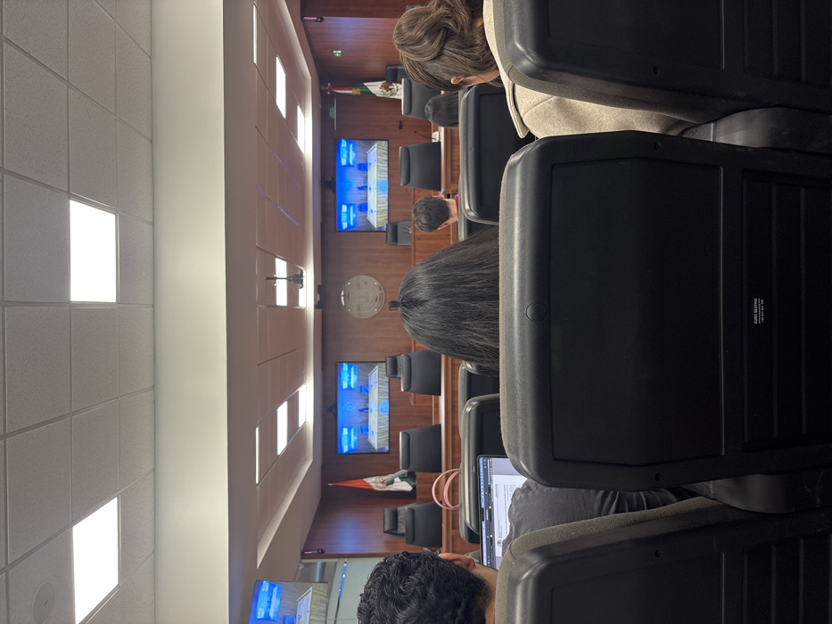The image depicts a formal meeting or conference room in San Andrés Cholula, Mexico, viewed from the perspective of a seated attendee
