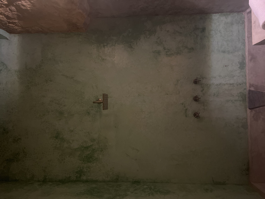 An empty, green-tinted shower room features textured walls and floor with subtle variations in color and pattern. A central, horizontal shower handle is visible on the left side, while three smaller shower heads are aligned vertically on the right. The ceiling appears slightly rocky or uneven. Part of a structure, possibly a wall or shelf, is visible on the right side. Overall, the room has a rustic or natural aesthetic.