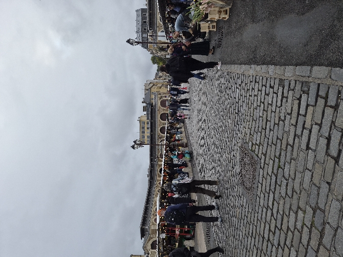 The image depicts an outdoor market scene at the Marché Notre-Dame in Versailles, France, under an overcast sky. The foreground features a cobblestone street with a circular metal manhole cover, adjacent to a narrow asphalt strip on the right. Numerous individuals, primarily adults, are distributed throughout the scene, walking or standing; several wear backpacks. Market stalls with various goods, including crates of flowers or plants on the right, line both sides of the street, some under canopies. In the mid-ground, two ornate, multi-fixture black lampposts stand on either side of the thoroughfare. The background is dominated by a large, arcaded market hall building with a dark roof and lighter facade, behind which additional multi-story city buildings are visible.