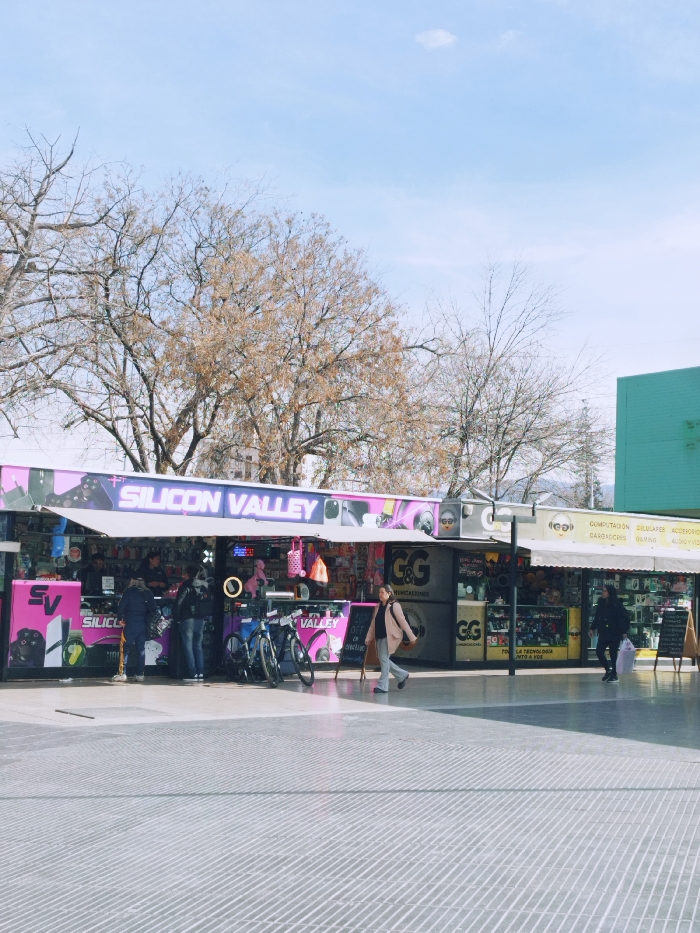 The image displays an outdoor commercial area in Unknown, Argentina, under a clear blue sky