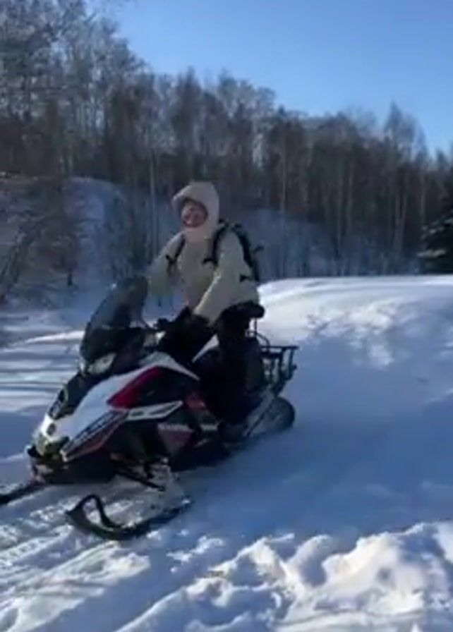- "A person wearing a white jacket and carrying a gray backpack is riding a white and black snowmobile on a snow-covered path near a wooded area on a sunny day" by FM-HXrzC3, licensed under CC BY 4.0