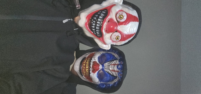 - "Two clown masks, one red and white, one blue, red, and white, sit on a black garment on a gray surface" by FM-TW7s93, licensed under CC BY 4.0