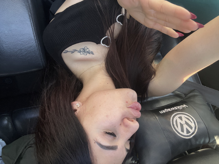 A female individual is depicted in a close-up, angled shot, occupying the passenger seat of a vehicle. Her head rests against a black, perforated neck pillow featuring a white Volkswagen logo and text. She has long, dark hair, and her eyes are closed with lips pursed in a pouting expression. A small, light-colored stud earring is visible in her right earlobe. A tattoo of a blooming flower on a stem with leaves is present on her left collarbone. She wears a black ribbed crop top featuring a silver-toned circular detail on the left shoulder strap. Her left hand, with long, dark red manicured nails, is partially visible in the lower left foreground, palm slightly open towards the viewer. The vehicle interior features black seating material and a visible seatbelt. The illumination suggests natural light from an unseen window to the left. No identifiable landmarks or external features are present to determine a specific location within Plovdiv, Bulgaria; the scene is limited to the vehicle's interior.