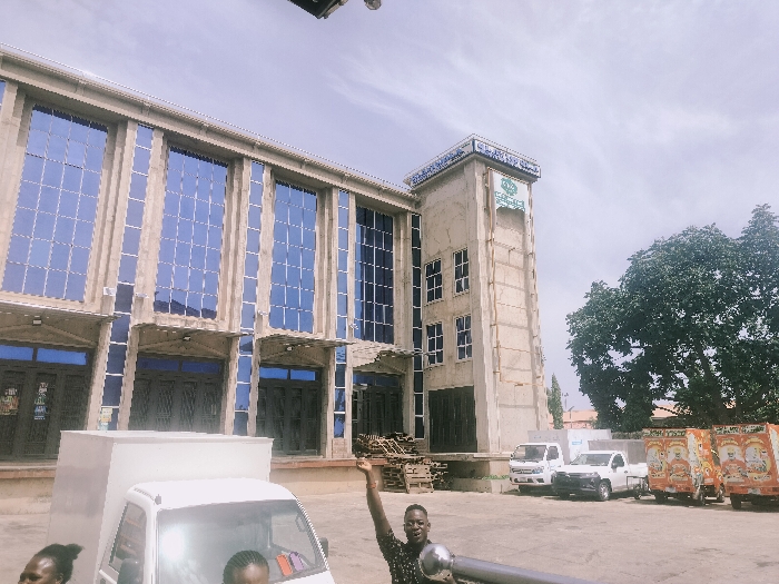 street scene in front of a multi-story building in Jos, Nigeria (latitude: 9.91, longitude: 8.894). The building is a commercial structure with large windows, a concrete facade, and a sign that reads "Flour Mills of Nigeria Plc." There is a white delivery truck parked in front of the building, and a man is standing in the street, raising his arm in the air. Behind the truck, there are other vehicles parked in the street. The building is a large, imposing structure with a concrete facade. There are several trees in the background. The scene is quiet and peaceful.