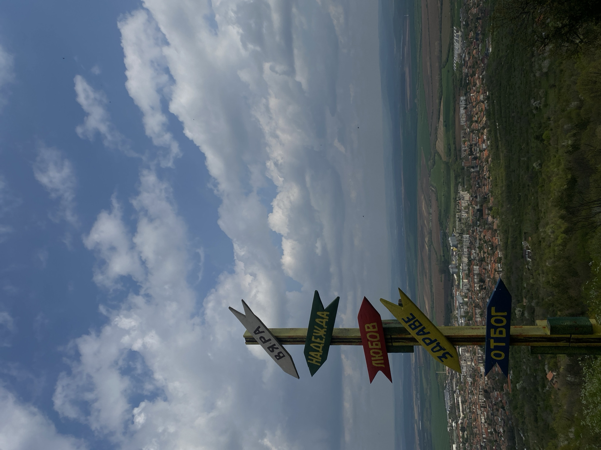 The image depicts a set of directional signs mounted on a wooden post overlooking the city of Lyaskovets, Bulgaria. The signs are painted in various colors and have Bulgarian words written on them. From left to right the words are "ВЯРА" (faith), "НАДЕЖДА" (hope), "ЛЮБОВ" (love), "ЗДРАВЕ" (health), and "ОТБОГ" (From God). In the background is the cityscape of Lyaskovets, transitioning into a landscape of fields. Above the signs and cityscape is a cloudy sky.