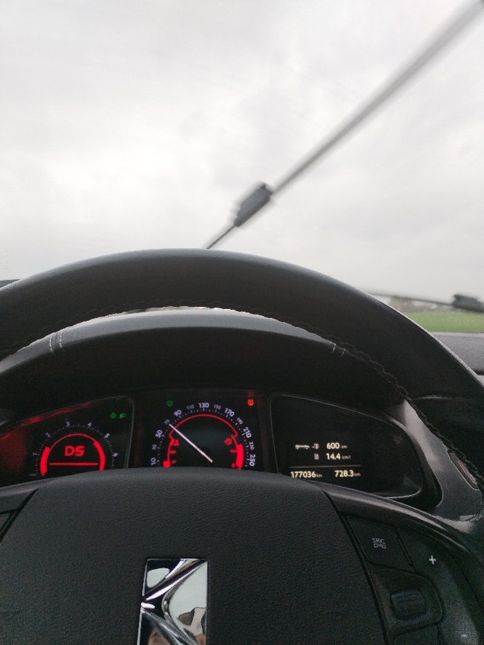 The image displays the interior of a DS Automobiles vehicle from the driver's perspective, focusing on the steering wheel and instrument cluster looking through the windshield. The specific location in the city of Unknown, Unknown cannot be determined. The lower portion of the frame is dominated by a black leather-wrapped steering wheel with a chrome DS logo at its center. Behind the steering wheel, the instrument cluster is illuminated in red. The speedometer needle indicates approximately 90 km/h. Digital readouts on the right display an odometer reading of 177,036 km, a trip meter of 728.3 km, an estimated range of 600 km, and average fuel consumption of 14.4 l/100 km. Multiple dashboard warning lights are illuminated. A windshield wiper arm is visible extending diagonally upwards to the right across the upper windshield area. The exterior environment, viewed through the windshield, consists of an overcast, light gray sky with a faint green landscape visible near the horizon. No individuals are present in the scene.