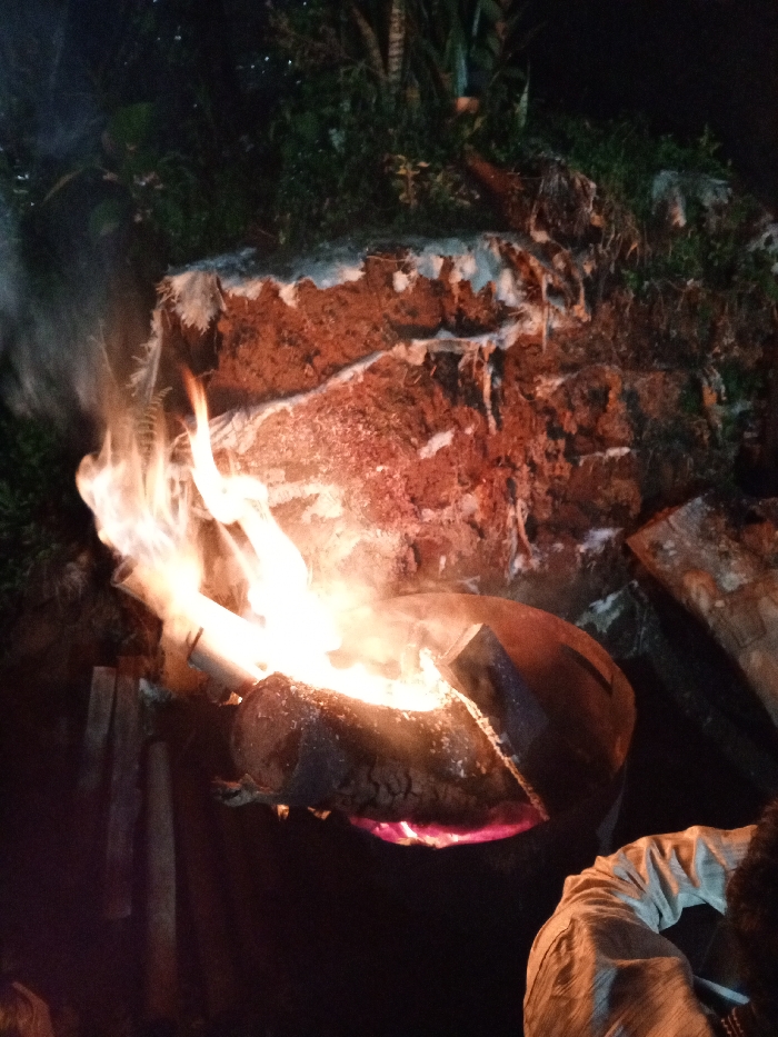 An outdoor scene in Catarman, Philippines, depicts a contained fire during nighttime. A metal drum or large container, possibly modified, holds burning logs and wood, emitting intense flames and smoke upward. The fire casts an orange-red illumination across the immediate area. In the background, an earthen bank with exposed roots and light-colored fibrous material rises, backed by dark, indistinct foliage. The lower right foreground shows the shoulder and arm of an individual, wearing a light-colored, long-sleeved shirt, partially obscured, indicating human presence near the fire.