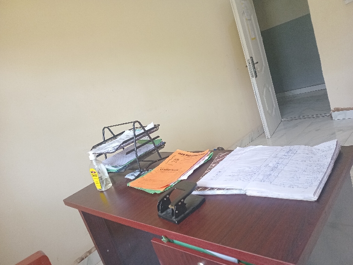 The scene depicts an interior workspace in Jalingo, Nigeria. A dark brown wooden desk is positioned centrally, holding various office items. On the desk's left, a clear plastic bottle with a yellow label (identified as hand sanitizer) stands next to a black, multi-tiered paper organizer filled with documents. Adjacent to these are several folders, including a prominent orange one with partial text "OFFICE" visible. A black two-hole puncher is centrally located on the desk. To the right, a thick, open ledger book displays numerous handwritten entries in blue or black ink. A green drawer handle is visible on the desk's front, and a fragment of a red chair is present in the lower-left foreground. The surrounding walls are light beige, and the floor is covered with light-colored, polished tiles. A white, panel-style door with a metallic handle is ajar on the right, opening to an adjacent room with grey walls and similar tiled flooring. No individuals, actions, or direct interactions are visible.