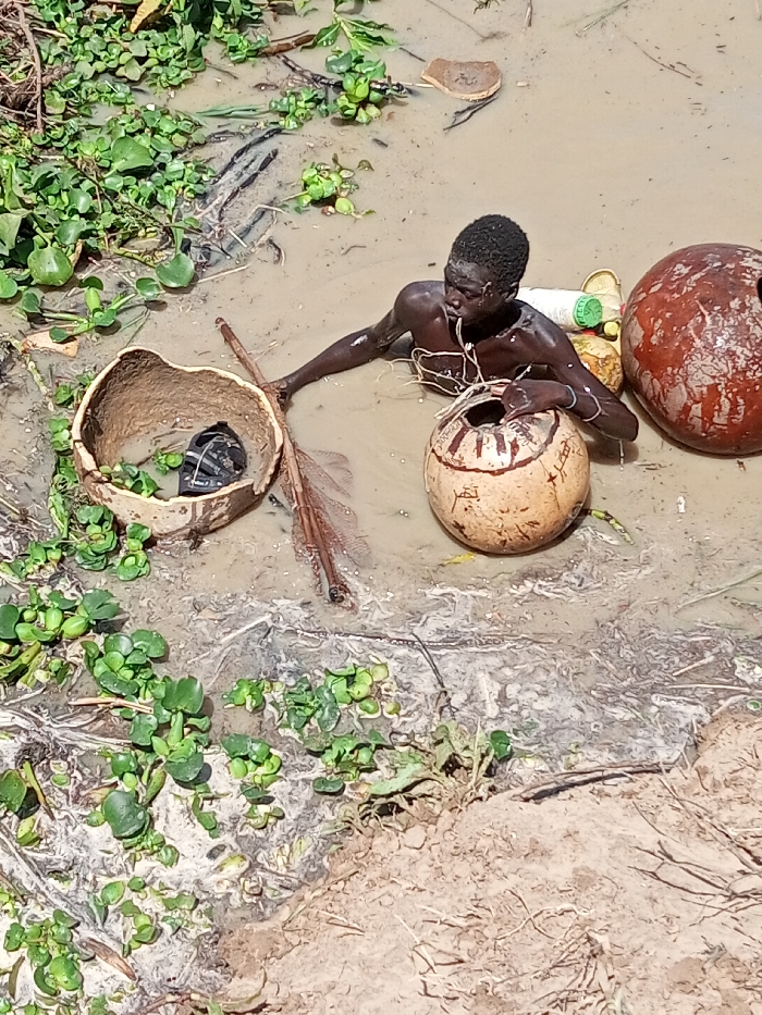 In Kokani North, Nigeria, a male individual is submerged from the chest down in light brown, muddy water. He is bare-chested, with white string visible around his neck and light-colored wristbands on both wrists. With his left hand, he holds a light brown gourd adorned with Arabic script and featuring an open top. To his right, a large, reddish-brown spherical gourd floats on the water. To his left, a split gourd, shaped like a bowl, contains a dark, wrapped object. A long wooden stick is partially submerged adjacent to the split gourd. A white plastic bottle and a green container float behind the individual, near the spherical gourd. The muddy water surface is extensively covered with green aquatic vegetation and some dark debris. A dry, earthy bank is visible in the bottom right foreground.