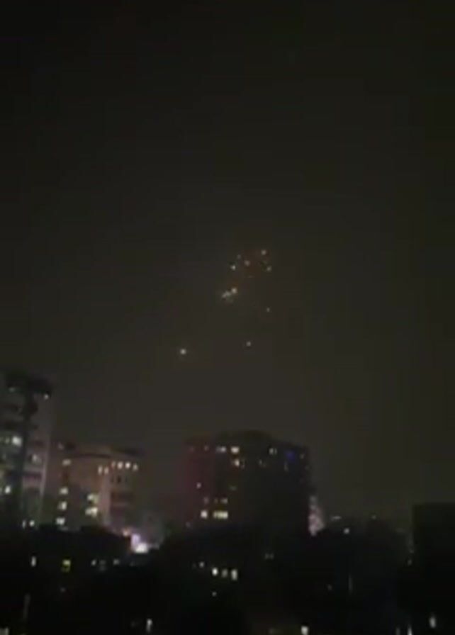 nighttime view of fireworks in the sky above a city. The fireworks are a cluster of golden sparks against a dark, hazy sky. In the foreground are several multi-story buildings with lit windows. The sky is dark and overcast, with a slight glow from the city lights.