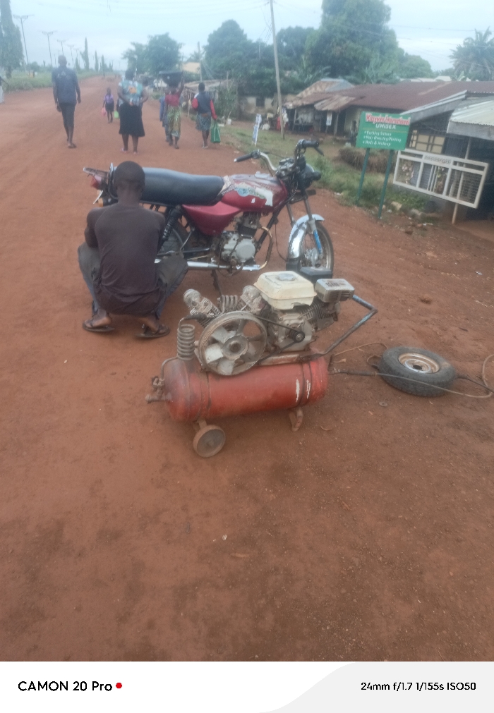 The image captures an outdoor scene on an unpaved, reddish-brown dirt road in Makurdi, Nigeria, under an overcast sky. In the foreground, a man, observed from behind, squats on the ground wearing a dark t-shirt, dark pants, and sandals. To his left, a red and black motorcycle with chrome fenders is parked on its kickstand. In front of the squatting man, a portable air compressor unit is positioned on the ground; it features a horizontal red air tank with wheels, topped by a gasoline engine and a compressor pump with a visible fan. A hose extends from this unit to a detached vehicle tire with a metallic rim, lying on the dirt to the right. In the middle ground, several pedestrians, including women carrying objects on their heads and a man, walk along the dirt road. The background displays multiple single-story buildings with corrugated metal roofs, some appearing weathered, amidst green foliage. A green and white sign partially visible on the right advertises "Mugadashious! UNISEX" and lists services such as "Teclia fabr," "washing," and "hair & makeup."