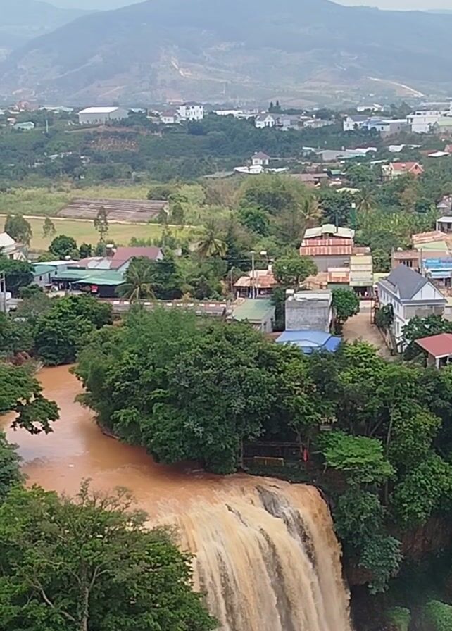 high-angle view of a landscape featuring a waterfall with reddish-brown water cascading over the edge. Above the waterfall, there is a river flowing into it, sharing the same color of muddy water. Lush green trees surround the river and waterfall. Beyond the greenery, a small town or village is visible, with houses and buildings dotted across the landscape. In the background, there's a mountain range, partially obscured by mist or haze. The sky overhead is overcast.
