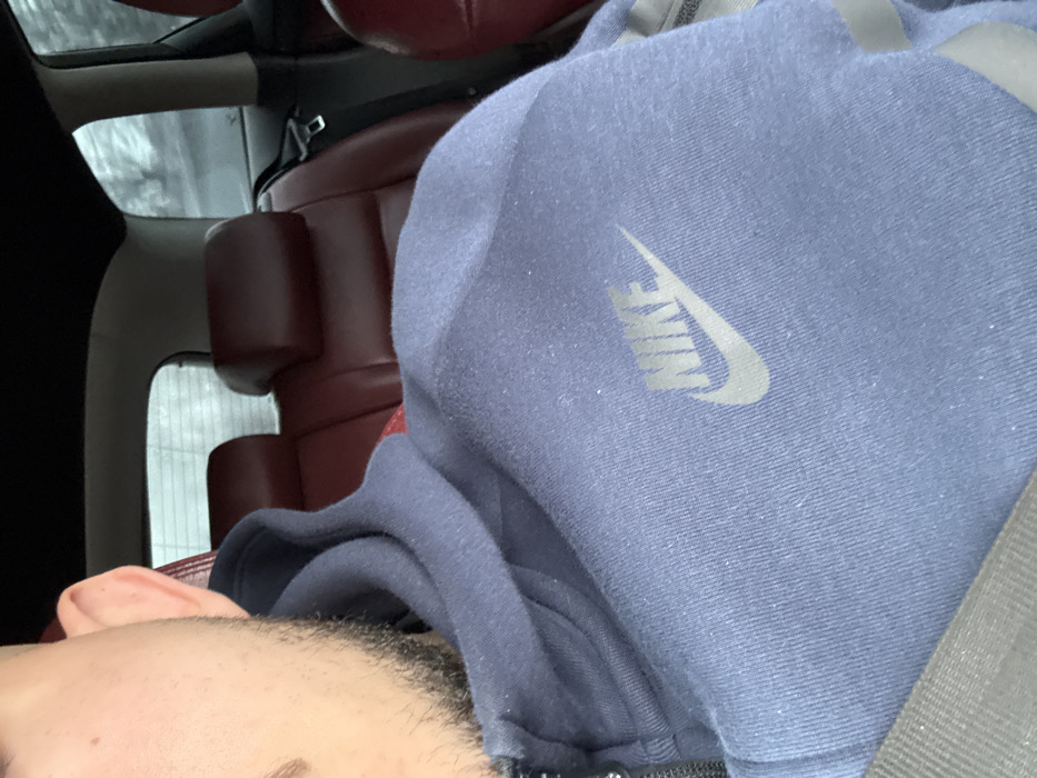 The scene is set inside a vehicle, located in Malinovo, Bulgaria. A male individual occupies the foreground, with only the right side of his head (ear and lower cheek with dark stubble) and upper torso visible. He is wearing a dark blue, possibly faded, hooded sweatshirt with a zippered front. A light grey "NIKE" logo is prominently displayed on the upper left chest area of the sweatshirt. A grey seatbelt strap diagonally crosses from the lower right to the upper left across his chest. The vehicle's interior features dark red leather upholstery for the rear seats, with two headrests clearly visible. The car's headliner is black. Through the rear window, a blurred outdoor environment is discernible, characterized by indistinct trees or vegetation, suggesting motion or an overcast day. No direct interactions are depicted.