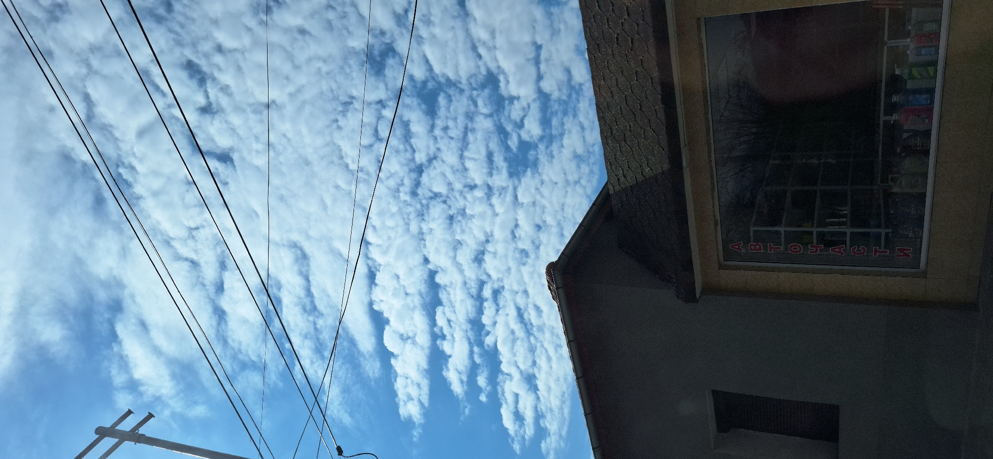 low-angle view in Kresna, Bulgaria, featuring a building with a visible window displaying the text "АВТОЧАСТИ" (translated as "Auto Parts"). The building has a dark roof. Overhead power lines are present against a backdrop of a blue sky with scattered white clouds. A white pole supporting the power lines is visible in the lower left corner.