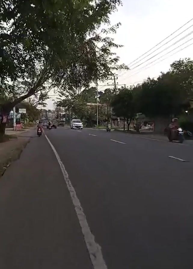 road with light traffic. Several motorcycles and cars are driving on the road in both directions. The road has a white line dividing the lanes. There are trees lining the side of the road, and power lines are visible overhead. The sky is overcast.