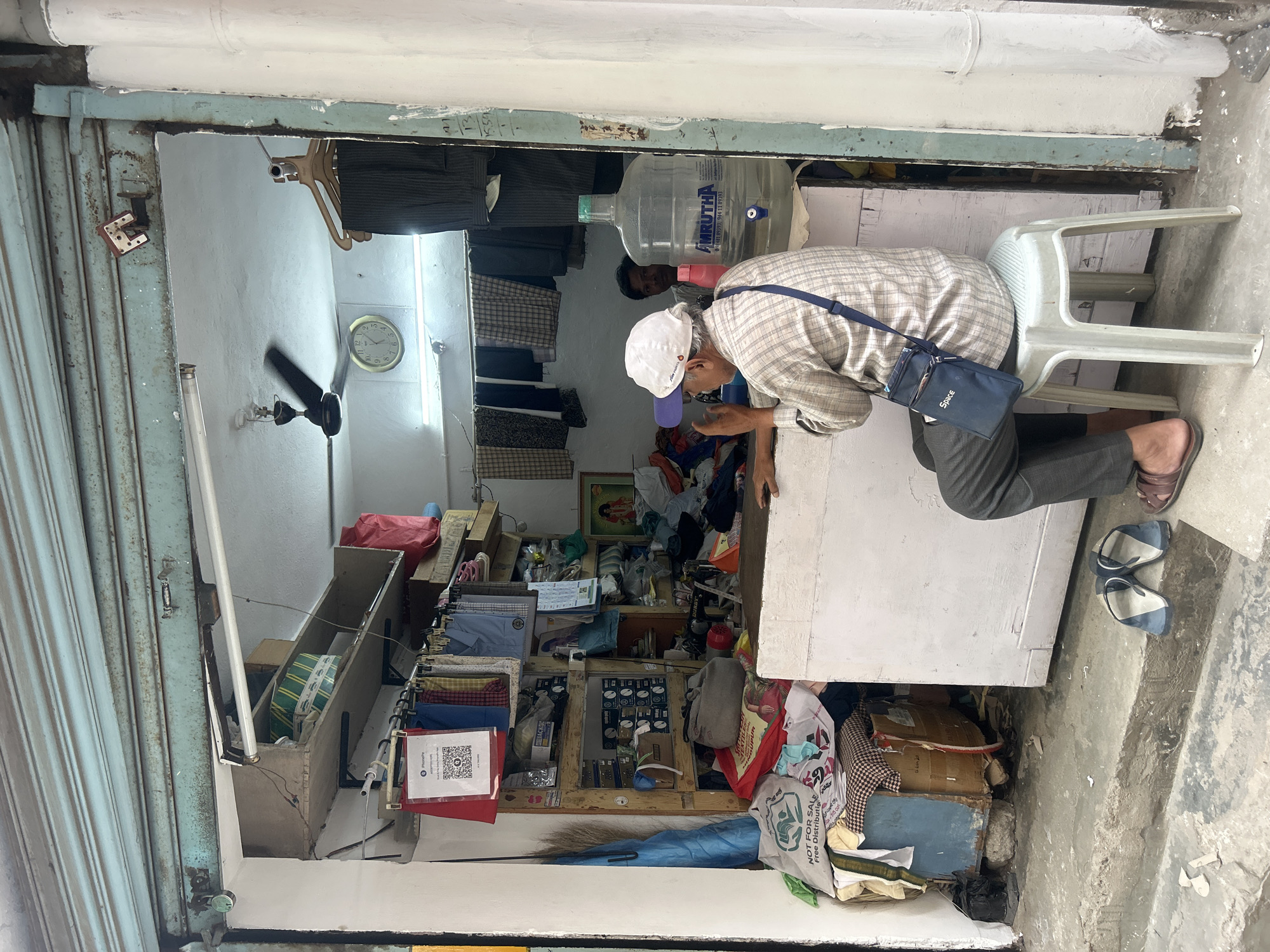This image depicts a small, open-front shop in Puttaparthi, India, likely a tailor or general repair establishment, viewed from a slight elevation outside. The entrance features a partially raised, faded light blue metal rolling shutter, rusted in sections, with a green padlock on the left side. The concrete ground immediately outside is uneven, showing wear, with a pair of blue and white flip-flops resting on it. Inside, the shop is narrow and cluttered. An older male subject, wearing a white baseball cap with a purple brim, a light plaid long-sleeved shirt, dark trousers, and brown sandals, sits on a white plastic stool in the foreground. He faces partially away from the viewer, looking into the shop's interior, with a small dark blue messenger bag labeled "Space" slung over his left shoulder. His right hand is near his chin. To the right of the seated man, on a white counter, stands a large, clear 20-liter "AMRUTHA" brand water bottle with a blue dispenser tap, and a smaller pink bottle next to it. Behind this, a second male subject with dark hair is partially visible in the shop's deeper interior. The shop's interior walls are light-colored. A black ceiling fan is in motion, and a fluorescent tube light illuminates the space. A round wall clock on the back wall shows approximately 8:05. Various garments, including shirts and trousers, are hung on display rods along the back and left walls. Wooden shelving units are packed with boxes, fabric, and miscellaneous items. A red and white "PhonePe" QR code for digital payments is prominently displayed on the left side, above stacked items. On the far left, a broom leans against the wall, and several bags, including one labeled "NOT FOR SALE Free Distribution," are piled on the floor and a small platform. A small red sewing machine motor is visible on a lower shelf on the left. A framed image, possibly of a deity, hangs on the back wall.