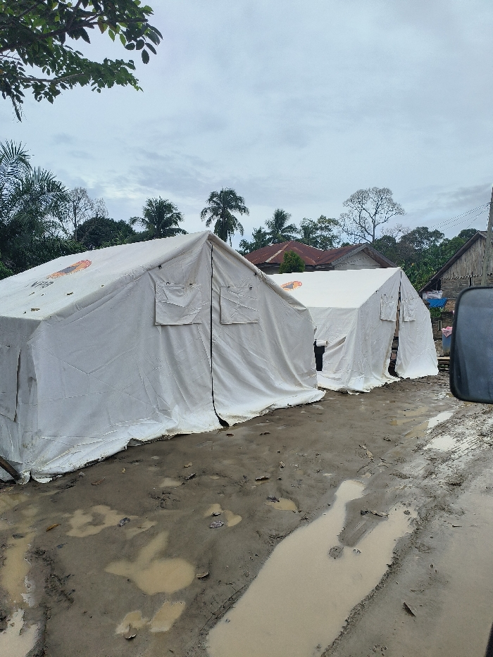 Two white tents sit in a muddy area. The ground is wet and filled with puddles. Buildings, including a house with a rusty roof, are in the background. Trees surround the area, and the sky is cloudy. A partial image of a vehicle appears in the right foreground. The tents seem to be temporary shelters in a potentially disaster-stricken area.