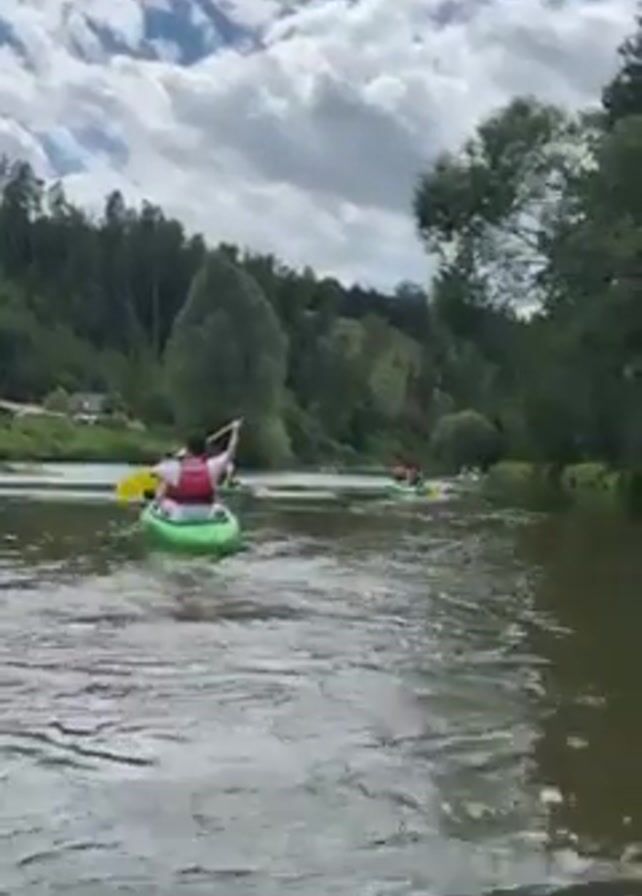 Here is a detailed description of the video: The video shows people kayaking on a river. There are several kayaks visible, each with one or more occupants. The people in the kayaks are wearing life vests. They are paddling their kayaks along the river, moving in the same direction. The camera seems to be positioned from within one of the kayaks, capturing the scene from the paddler's perspective. The paddle of the kayak in which the cameraman is riding is visible in the foreground. The river is surrounded by lush greenery, with trees and vegetation lining the banks. The sky is partly cloudy. The scene appears to be taken on a sunny day.