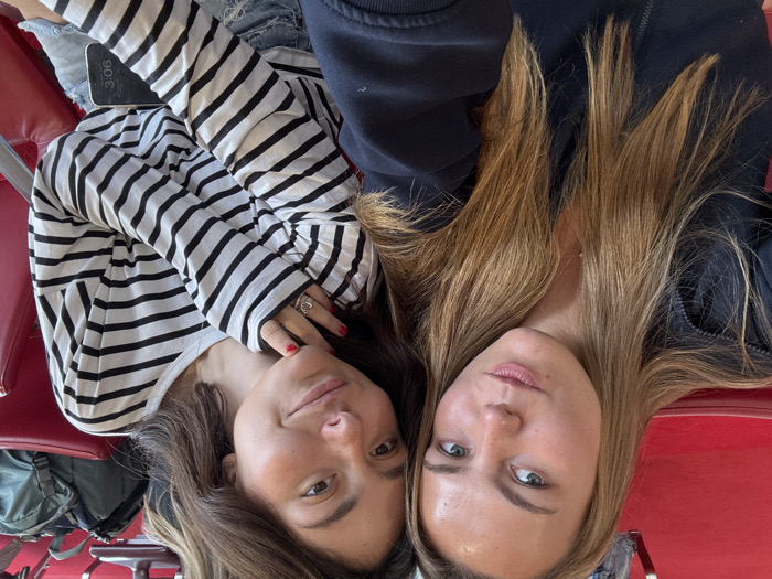Two young adult females are seated in what appears to be an airport terminal waiting area located in Le Mesnil-Amelot, France. The female on the left has long, light brown hair and is wearing a dark, possibly navy or black, zippered jacket. She is looking slightly to her right. The female on the right has shoulder-length dark brown hair and is wearing a white long-sleeved shirt with black horizontal stripes. Her right hand, featuring red nail polish and a ring on the ring finger, is near her chin. A black smartphone displaying "3:06" is visible on her right thigh. Both individuals are positioned closely together, suggesting a self-portrait. The environment includes bright red upholstered seating and a dark green backpack visible in the background.