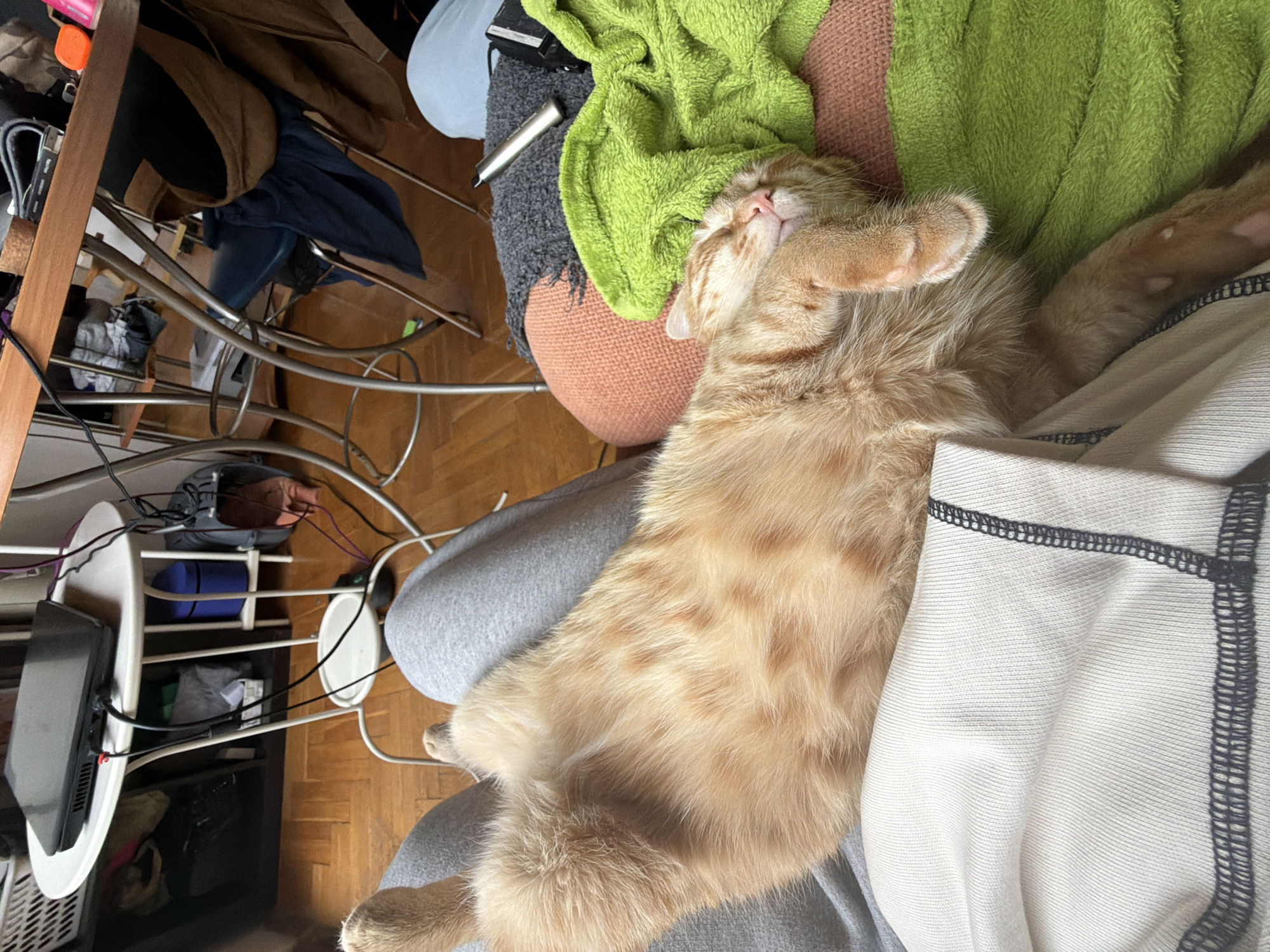A medium shot from a high angle shows an orange tabby cat asleep on a person's lap. The person is wearing grey sweatpants and a white garment. A bright green hand towel lies near the cat’s head, and the cat’s paw is resting on its face. The background includes a cluttered room with a wooden floor, a white multi-tiered table with various objects on it, and a metal chair with clothes hanging on it. The location is likely indoors, possibly in a residential area in Sofia, Bulgaria, based on general characteristics of interior decor and furnishing styles common in that region. There is no one else visible in the image.