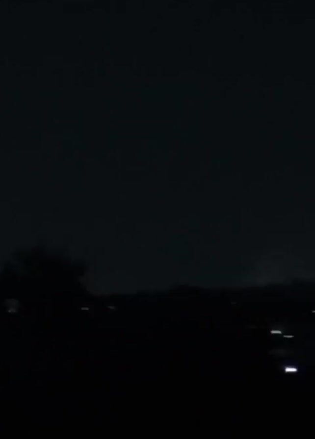 dark night scene with a blurry cityscape or town in the distance. Occasional lights are visible within the landscape. A bright flash occurs in the sky, possibly a firework or other pyrotechnic display, followed by a series of smaller flashes and lingering smoky trails. The foreground is primarily dark, with the silhouettes of trees or shrubs. The overall impression is one of darkness punctuated by sudden, bright bursts of light.