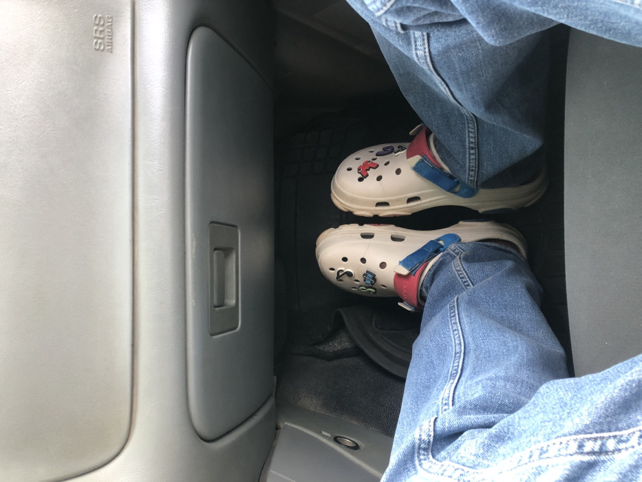 This image depicts the interior of a vehicle, specifically the front passenger footwell area, located in the city of Bauchi, Nigeria. The view is from a seated perspective, looking down. The upper portion of the frame shows a light grey dashboard and a closed glove compartment featuring a central recessed handle. The text "SRS AIRBAG" is visible on the dashboard in the upper right quadrant. The lower half of the image features the legs and feet of an individual. The person is wearing blue denim jeans. Their feet are clad in a pair of light beige (off-white) Crocs-style clogs, each with a red and blue heel strap. The left clog is adorned with multiple colorful Jibbitz-style charms, including one with blue lettering on a yellow background. The right clog also displays several charms, notably a red Mickey Mouse head outline and another with red text or numbers, possibly "26" or "5G." The vehicle's floor is covered with dark matting. A dark, possibly black, object with a visible metallic ring is partially present on the far left of the footwell area.