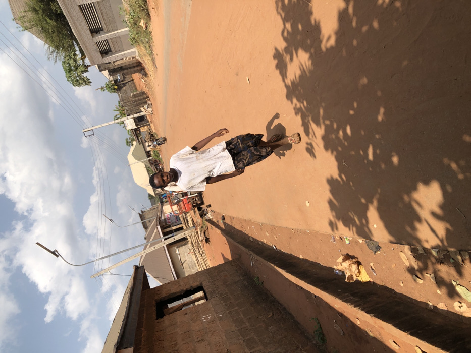 The scene depicts a young male standing on an unpaved, reddish-brown laterite road in Aguleri, Nigeria, under a sky with scattered cumulus clouds