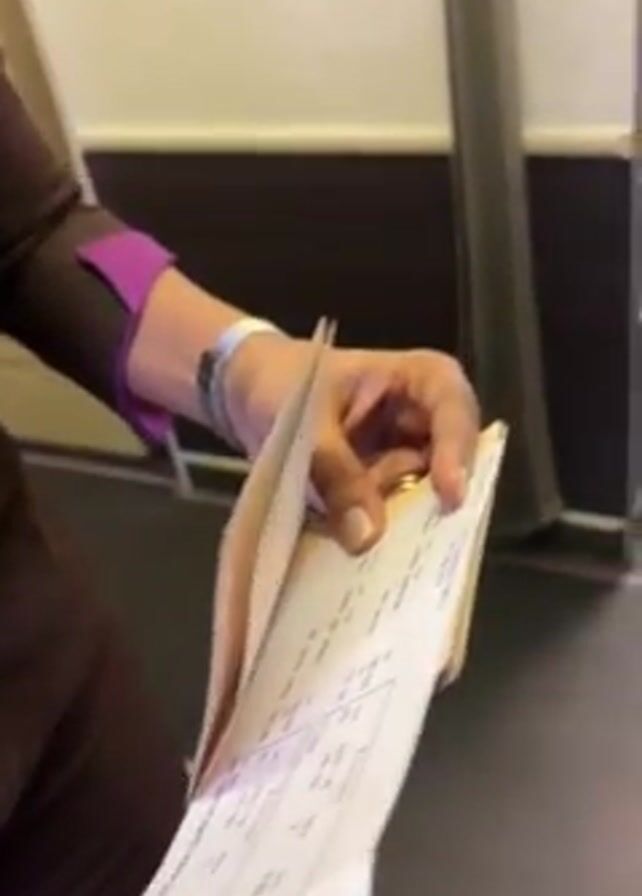 A person in a brown uniform with purple trim flips through papers, then hands them off to another person, who is wearing grey pants and a green safety vest. The person in grey walks down a narrow corridor on an airplane, between carts.