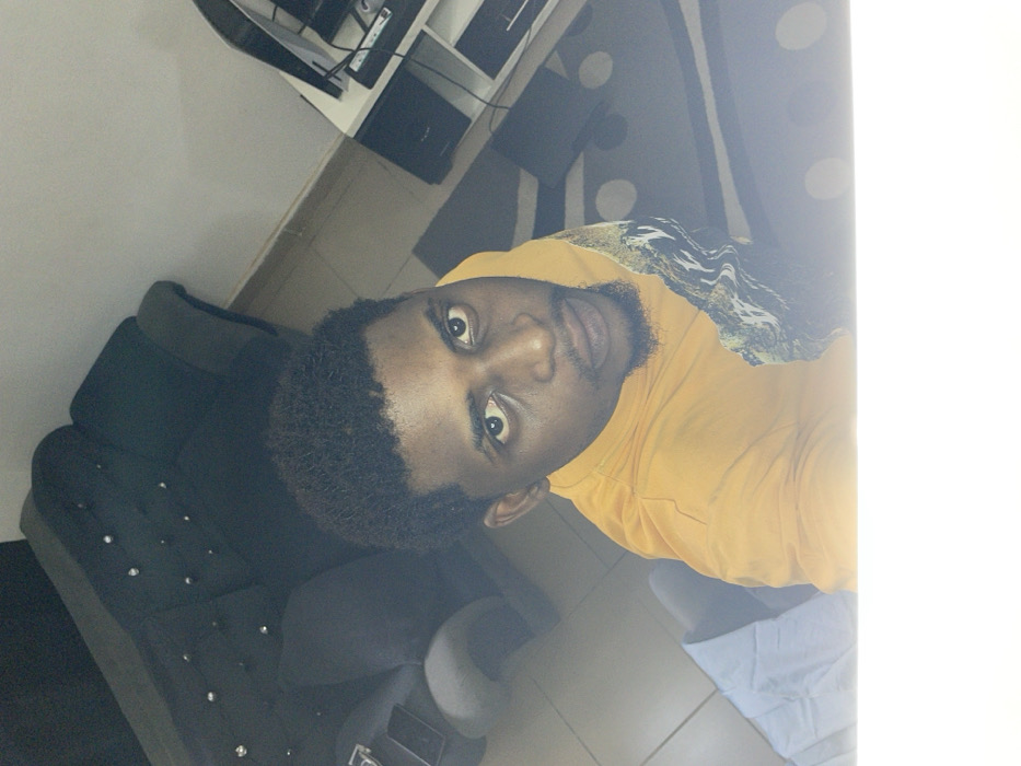 A bearded, dark-skinned man in a yellow shirt is facing the camera. He has short, dark hair. The background features a black couch, a rug with circular patterns, and a white cabinet with electronic devices. The floor is tiled in beige, and a bright light source is present on the right side of the image.
