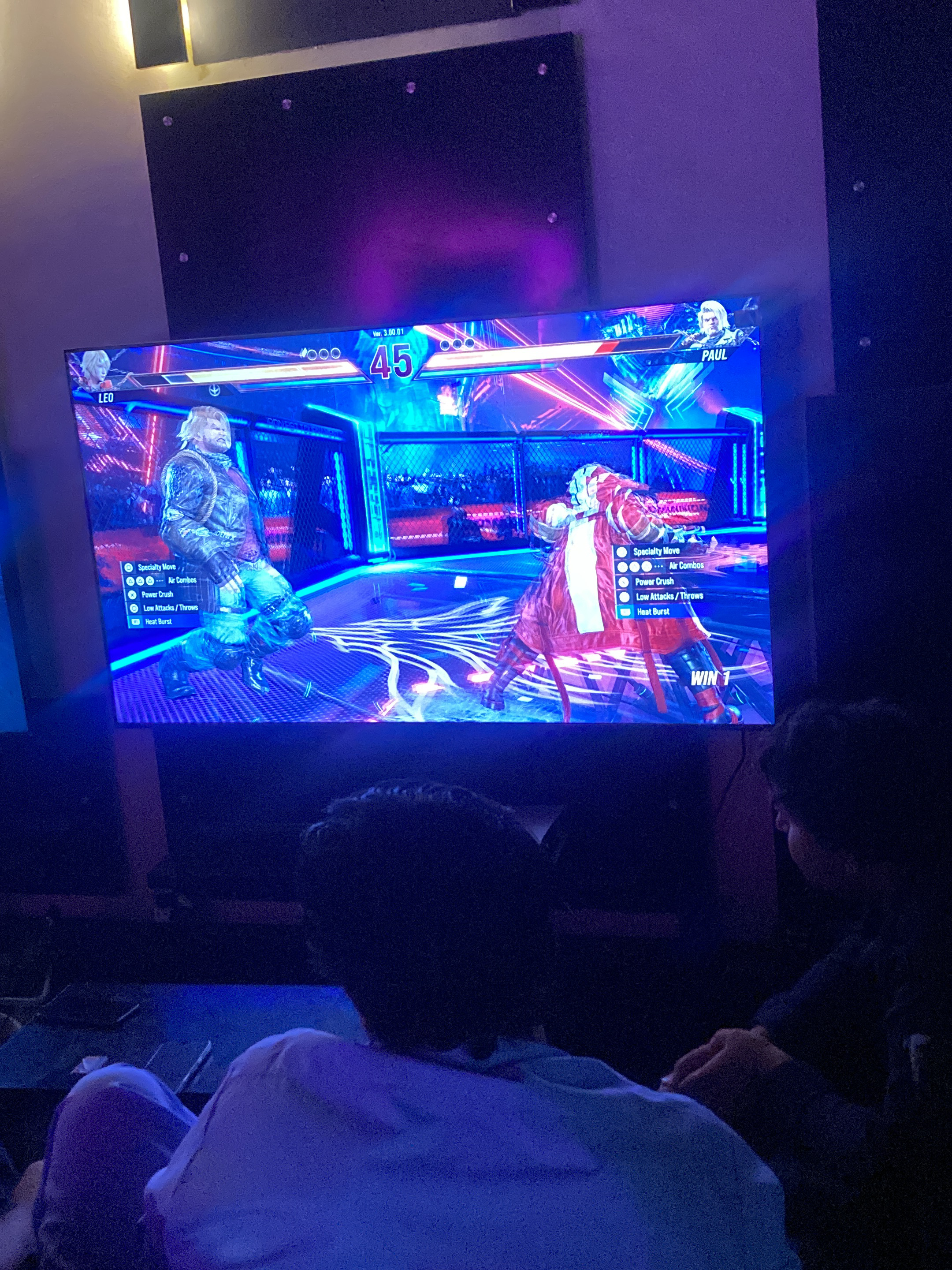 This image depicts an indoor gaming environment, presumably located in Quetta, Pakistan. A large, widescreen television is centrally positioned, displaying an active match from the fighting video game "Tekken." The game features the character Leo on the left and Paul on the right, with health bars and a round timer (showing '45') visible at the top of the screen. Two individuals are seated with their backs to the viewer, facing the television. The person on the left wears a light-colored top and pants. The person on the right wears a dark top, with their hands positioned as if operating a game controller, although the controller itself is not clearly visible. Both individuals appear to be actively engaged in playing or observing the game. The room is dimly lit, with prominent blue and purple ambient light emanating from the television screen and possibly additional hidden lighting sources. Dark, rectangular panels are mounted on the wall above the television, some with faint illumination. A dark surface, possibly a table, is partially visible in the foreground.