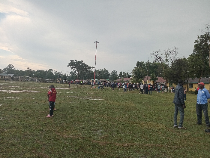A cloudy day captures an outdoor scene of a grassy field with puddles. A soccer goal and spectators are visible in the distance. A crowd gathers in the middle ground, while a light pole stands tall. Closer to the camera, a child in a red jacket stands still, and two men in casual attire converse on the right.