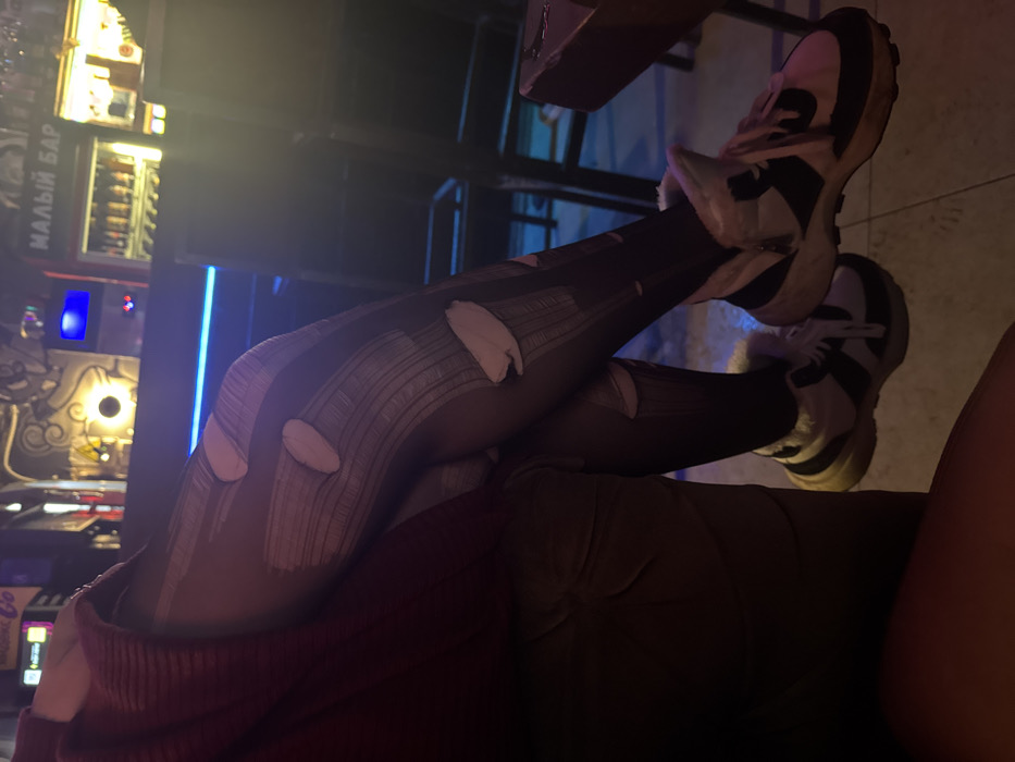 The scene depicts the lower body of a person seated inside "Малый Бар" (Small Bar) located at Sovetskaya St, 2/10, Saratov, Saratov Oblast, Russia. The individual wears a dark red top, dark brown lower garments (likely shorts or pants), and black sheer tights/stockings characterized by numerous vertical rips and tears exposing skin underneath. Their legs are crossed at the ankles. On their feet are black and white sneakers or boots, featuring visible white faux fur lining at the ankles, white laces, and thick, ridged soles. The background includes a dimly lit bar area with a wooden counter, bottles, and glasses illuminated by yellow lights. A refrigerator with bottles is visible behind the bar. A horizontal blue neon light strip is present along the bar counter. Two dark bar stools are partially visible to the right, and the floor beneath appears tiled. The overall environment is an indoor, low-light setting characteristic of a bar or pub.