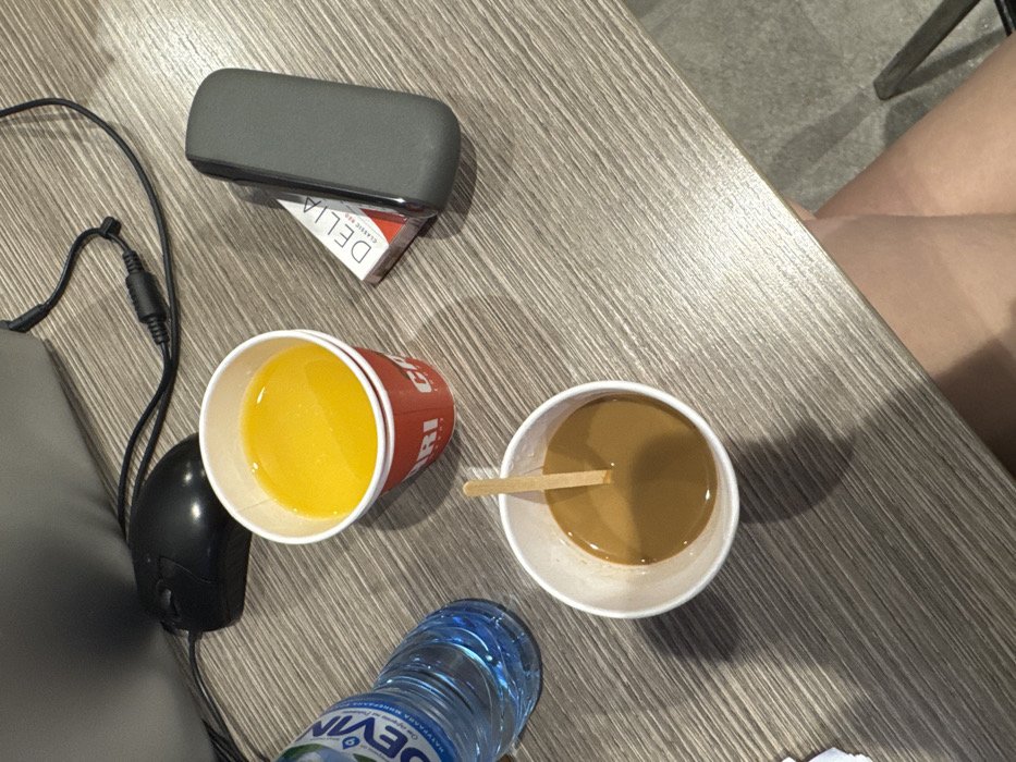 The scene depicts a light-colored, wood-grain laminate tabletop viewed from above. A black wired computer mouse is visible in the upper left, with two black cables extending across the surface. On the table, from left to right, are: a partially full clear plastic bottle of DEVIN brand water with a blue cap; a red and white paper cup branded "CAPRI CAFE," containing a yellow liquid; a white paper cup holding a light brown liquid with a thin wooden stirring stick vertically inserted; a white and red pack of "DELIA CLASSIC RED" cigarettes; and a dark gray, elongated rectangular electronic device. The lower right portion of the image shows the bare upper leg/thigh of a person, indicating an individual is seated at the table. The environmental context and branded items, specifically DEVIN water and CAPRI CAFE, are consistent with products and establishments found in Plovdiv, Bulgaria.