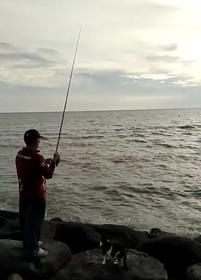 man fishing off a rocky shore near the ocean. The man is wearing a maroon shirt, jeans, and a baseball cap. He is holding a fishing rod and casting his line into the water. A black and white cat is sitting on the rocks near the man. The ocean is choppy and the sky is cloudy.