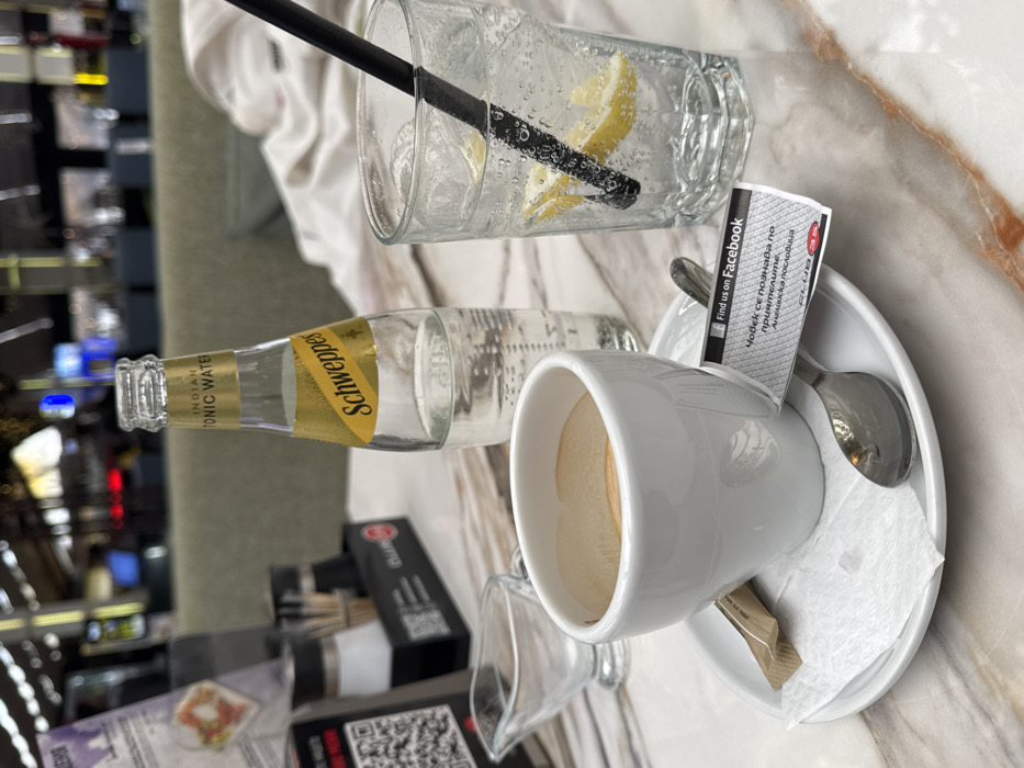 The image displays a table setting in a modern indoor cafe or restaurant, likely within a commercial center in Sofia, Bulgaria. The tabletop is a light-colored marble with prominent brown and red veining. In the foreground, from left to right: - A white ceramic espresso cup, approximately one-quarter full of dark liquid, rests on a white saucer. - Beneath the cup, a small, white, folded paper napkin holds a sealed brown sugar packet. - A silver teaspoon lies on the saucer beside the cup. - A white rectangular card, featuring a "Find us on Facebook" logo and Bulgarian text ("Човек се познава по приятелите" - A man is known by his friends, and "Английска пословица" - English proverb, along with "CLUB BB"), leans against the cup and spoon. - Behind the espresso cup, a small, empty, clear glass gravy boat or creamer is visible. - A clear glass bottle of "Schweppes Indian Tonic Water," open and approximately two-thirds full of clear liquid, stands upright. - A tall, clear drinking glass contains clear liquid with several ice cubes and two lemon wedges. Numerous bubbles adhere to the inner surface of the glass, and a black drinking straw is submerged within the liquid. The background is out of focus, revealing the interior of a spacious establishment. Elements visible include a menu or display stand with Cyrillic text and a QR code on the far left, a condiment caddy, blurred modern seating (possibly upholstered in green or grey), and ambient lighting fixtures, consistent with a contemporary dining or lounge area. No individuals are present in the frame. The items on the table suggest recent or ongoing consumption of beverages.