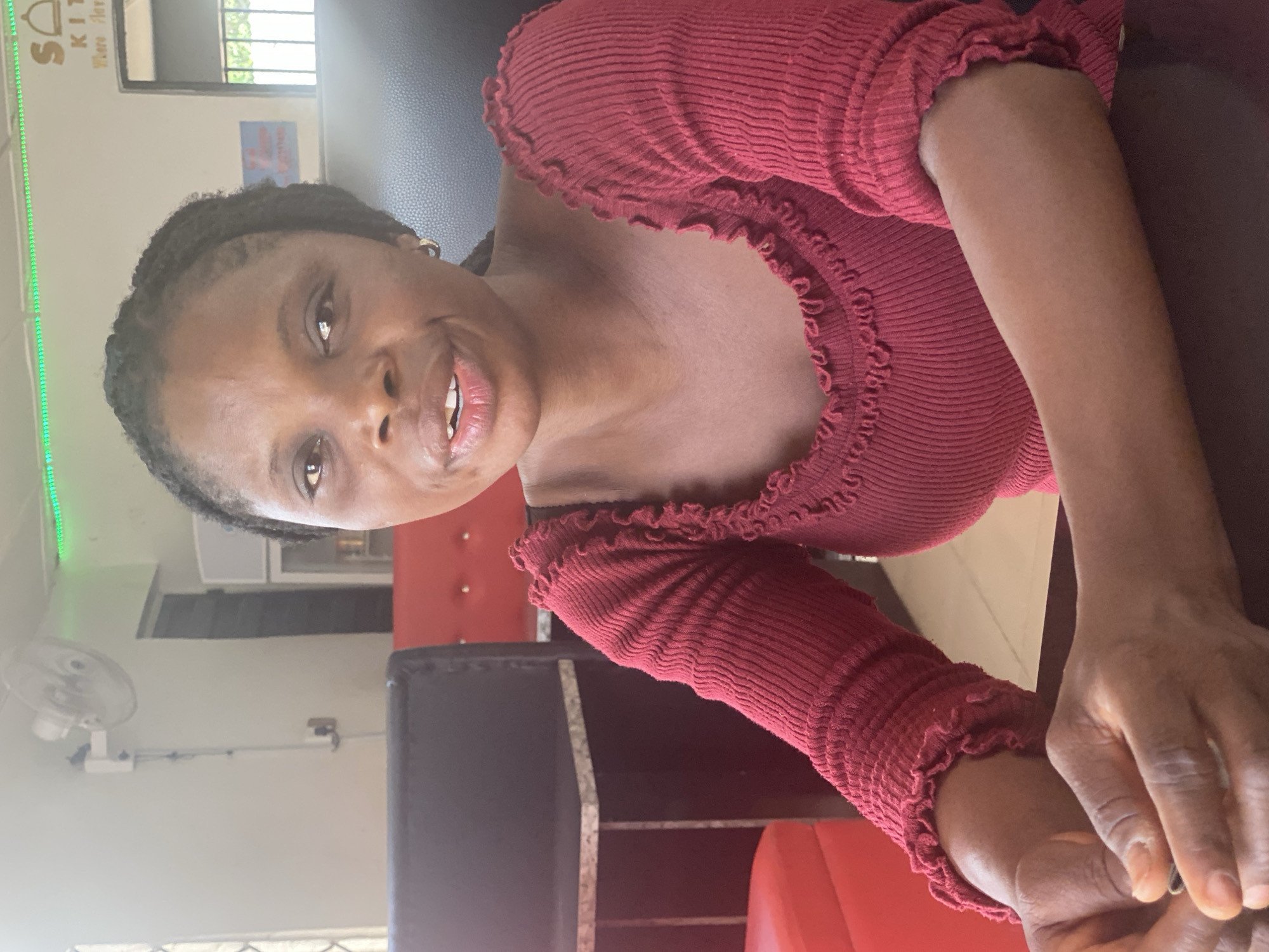 An adult female is seated indoors at a commercial establishment, likely a restaurant or cafe, in Zango-ndaji, Nigeria
