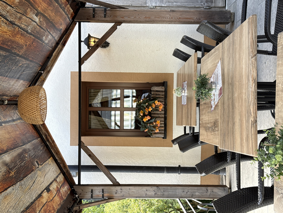 This image depicts an empty outdoor patio dining area, likely belonging to an establishment in Vianden, Luxembourg. No individuals are present in the scene. The foreground and midground are occupied by multiple unoccupied tables and chairs. Two wooden-topped tables are prominent, each furnished with a small potted green plant. The table closer to the viewer also has folded paper items, possibly menus. The chairs are dark-colored with a woven texture. Above the dining area, a pitched canopy roof features a ceiling patterned to resemble wooden planks. A single woven wicker pendant lamp hangs centrally from this canopy. The support structure for the canopy includes dark metal and natural wood beams and posts. The background consists of a building facade. The wall is primarily white stucco, with an ochre-colored trim surrounding a central, brown-framed, multi-paned window. Inside the window, sheer curtains are visible. Directly below the window, a wooden window box contains vibrant orange flowers and green foliage. To the right of the window, a black, ornate wall-mounted lantern with a visible warm yellow light source is affixed to the white wall. To the left of the window, a dark vertical pipe (downspout) runs parallel to a wooden support post. Beyond the left side of the patio, green trees and foliage are visible, partially obscured by a dark metal railing. On the far right, a section of a dark wooden door or panel is partially visible. The overall environment suggests a well-maintained, welcoming outdoor dining space.