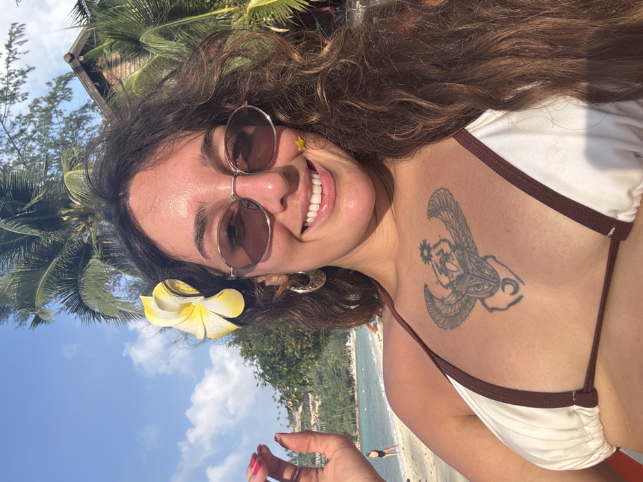 The image displays a close-up, outdoor portrait of a female subject, appearing to be in Baan Wang Ta Kien, Thailand, under clear, sunny conditions. The subject, centered in the frame, smiles broadly directly at the camera. She has long, wavy dark brown hair, wears dark oval-shaped sunglasses with a thin metal frame, and silver patterned hoop earrings. A yellow-and-white plumeria flower is tucked behind her left ear, and a small yellow star-shaped sticker is visible on her right cheek. She is wearing a white bikini top with brown trim. A tattoo depicting a winged scarab beetle holding a sun disk and crescent moon is prominently visible on her sternum. Her left hand, with fingernails painted red, is partially raised on the left side of the frame. The background features a tropical beach scene with light blue ocean water meeting a sandy shore. Further back, green tropical vegetation, including palm trees, is present. In the mid-ground, a person in a dark swimsuit walks along the beach. Distant hills or landmasses with scattered buildings are visible across the water on the horizon.