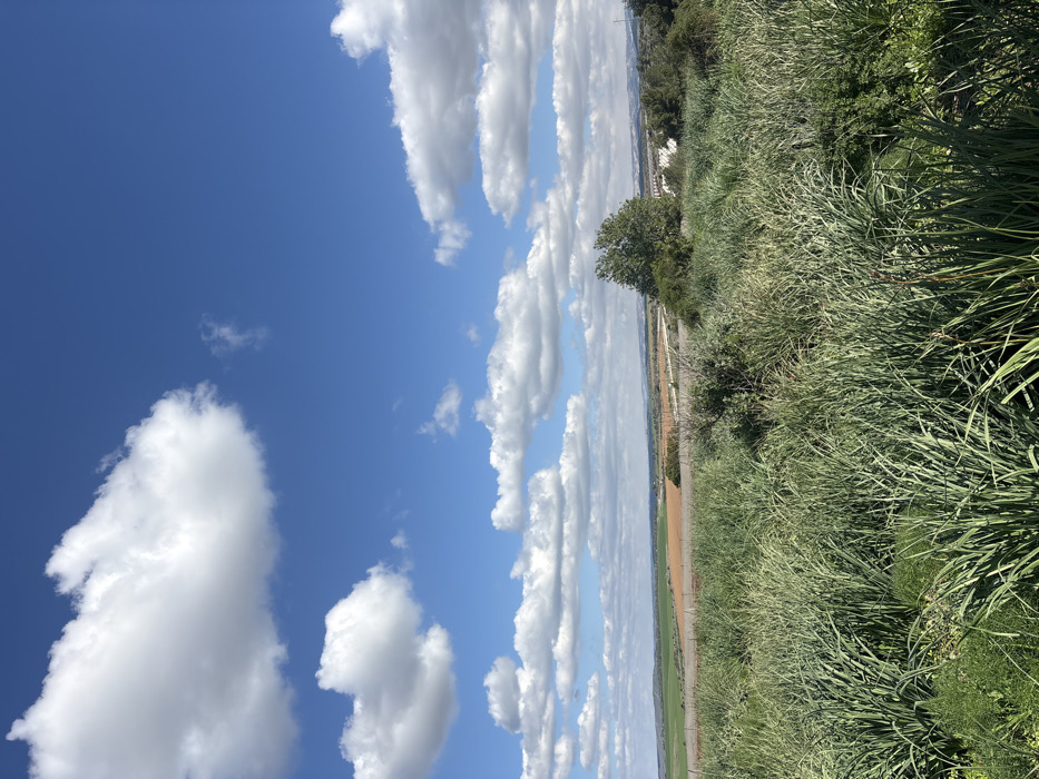 The image presents an open rural landscape within the Lachish Regional Council, Israel. The foreground is filled with dense, tall, green grasses and various herbaceous plants. Beyond this vegetation, the midground features cultivated fields, including a prominent section of reddish-brown earth and areas of lighter green crops, bisected by a visible dirt road or path. A cluster of trees, with one larger specimen, stands on the right side of the midground. In the far distance, indistinct white structures are partially visible among sparse trees and undulating terrain. The background consists of a wide, clear blue sky populated by numerous scattered white cumulus clouds of varying sizes. No individuals, animals, or active subjects are discernible in the scene.