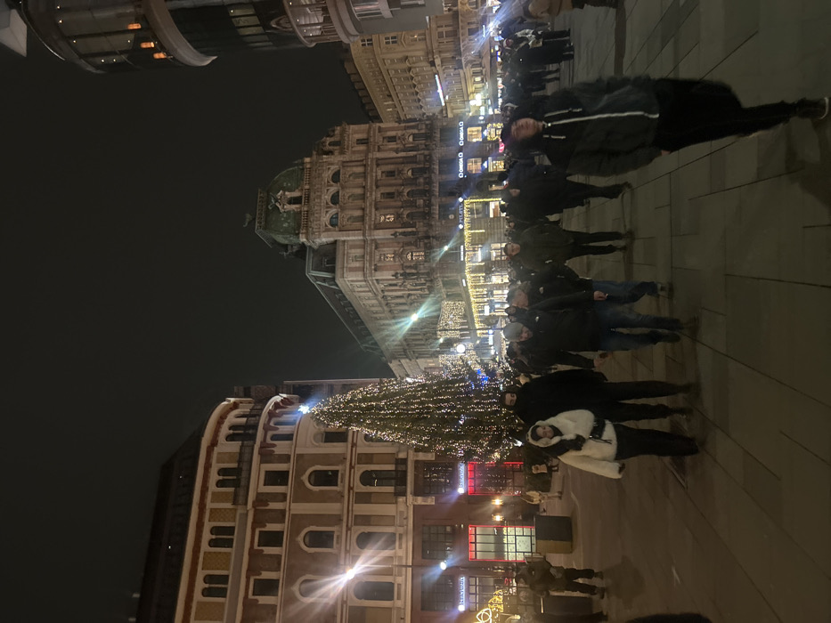 At night, a bustling city street is illuminated by lights strung across buildings and a large Christmas tree. People stroll along the sidewalk, some dressed in winter coats and hats. Buildings line the street, including one with a distinctive dome. The sky is dark, suggesting it is late in the evening. A modern building is partially visible in the top left.