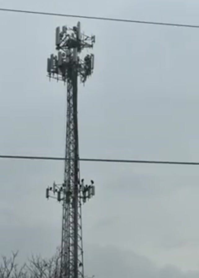tall cell tower against a gray sky. There are several large antennas at the top of the tower, and multiple birds are perched on the tower's structure. Power lines run horizontally across the frame in the foreground and background, partially obscuring the view of the tower. Bare tree branches are visible at the bottom of the frame, indicating it might be winter. The scene is static, with no apparent movement beyond what might be attributed to the camera operator adjusting their grip.