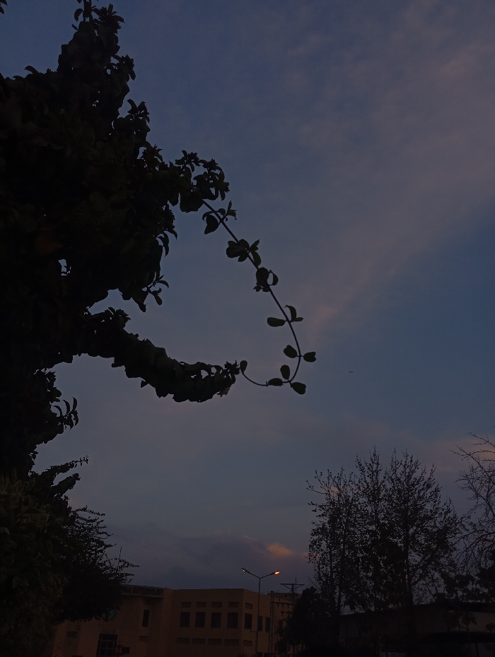 The image depicts an outdoor scene at dusk or dawn in the city of Chah Sultan, Pakistan, characterized by low ambient light. The upper two-thirds of the frame are dominated by a dark blue-grey sky with faint, indistinct clouds. A subtle pinkish-orange glow is visible near the horizon on the right. In the immediate foreground on the left, a large, dark silhouette of dense foliage, consistent with a tree or large bush, is present, with a distinct vine-like branch featuring individual leaves extending diagonally towards the center of the frame. Below the horizon, a tan or light brown multi-story building with visible rectangular windows is situated. A partial sign on the building's facade reads "NATIONAL INSTITUTE OF BIOTECHNOLOGY." To the right of the building, an illuminated street lamp with an orange light source stands on a pole. Further to the right, a cluster of silhouetted deciduous trees, appearing bare or sparsely leafed, rises against the sky. No people, animals, or active subjects are present in the scene.