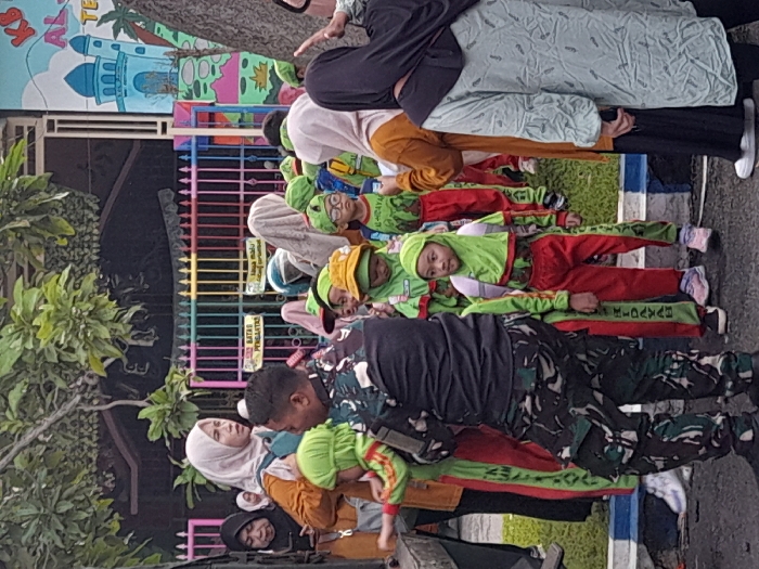 A group of people, including adults and children dressed in matching green and red outfits, are lying on the ground in a line. Some adults are wearing hijabs, and one person is dressed in military camouflage. They appear to be participating in an outdoor event or activity, possibly at a school or kindergarten, as there is a colorful fence and building sign visible in the background. The scene captures a community gathering or organized activity involving children and adults.