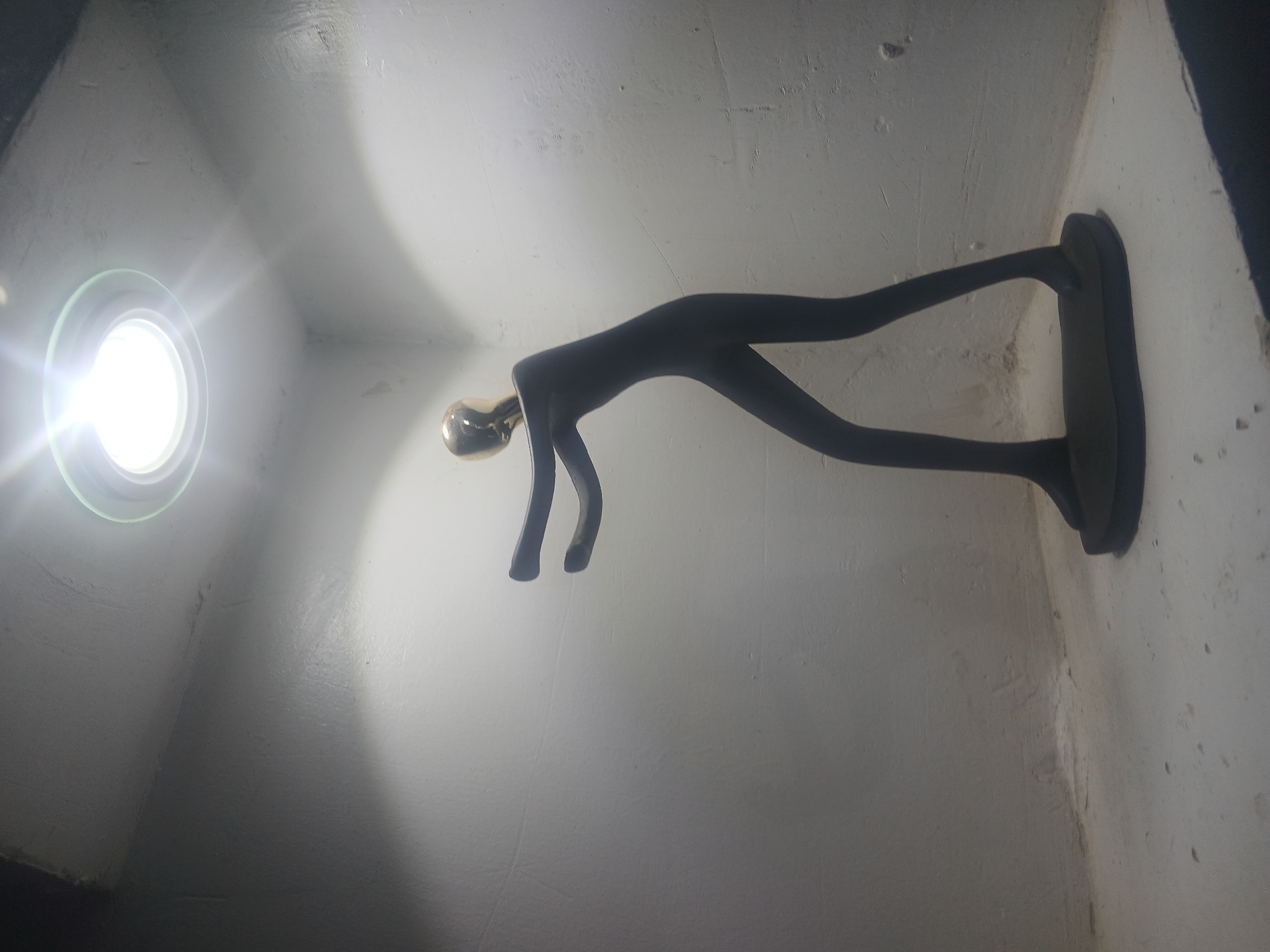 The scene is located in a small, white corner room or alcove in Masaka, Nigeria. A human-like statue is centrally positioned, presenting a dark grey or black, slender body with a metallic gold-colored head. The statue stands on a dark, flat base and is depicted in a leaning-forward posture with both arms extended forward, suggestive of pushing or bracing. Overhead, a bright, circular recessed light fixture illuminates the subject and the immediate environment. The walls and floor are uniformly textured and white, exhibiting minor surface imperfections, discoloration, and scattered specks.